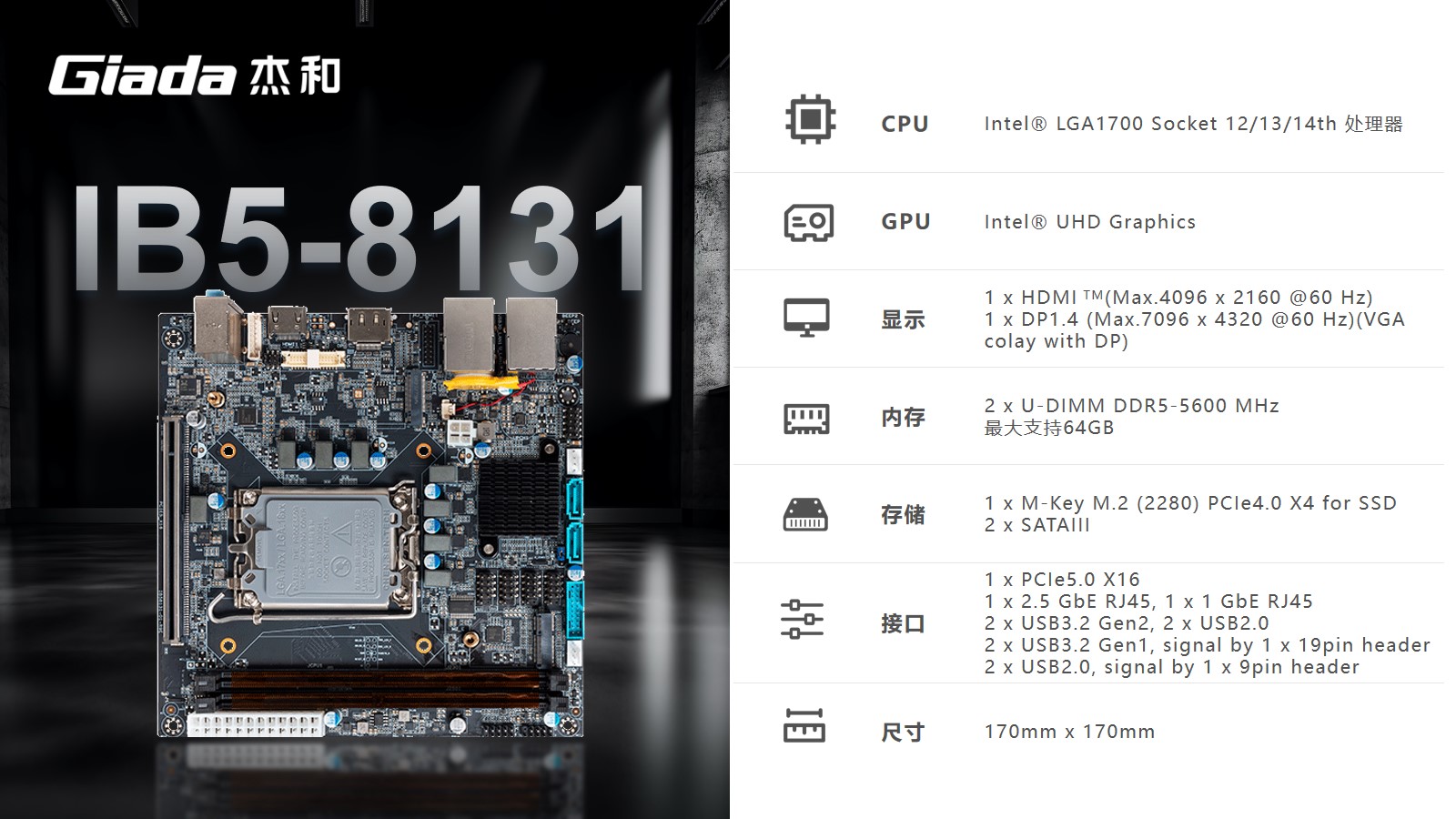 中国·世俱杯Mini-ITX主板IB5-8131采用Intel® B760芯片组,支持Intel® LGA1700 Socket第12/13/14代CPU。支持1 x HDMI (Max.4096 x 2160 @60 Hz);1 x DP1.4 (Max.7096 x 4320 @60 Hz)(保留 VGA位置)。