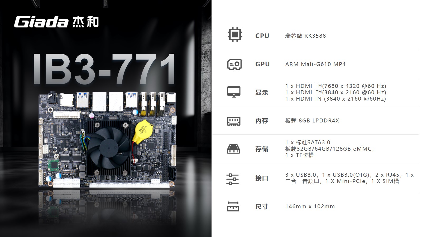 中国·世俱杯工业级ARM主板IB3-771采用瑞芯微RK3588处理器,内置G610 MP4 GPU,拥有6 TOPS算力的NPU,支持8K视频硬件解码编码及多摄像头输入,支持eDP/DP/ HDMI2.1/MIPI 多种显示接口。