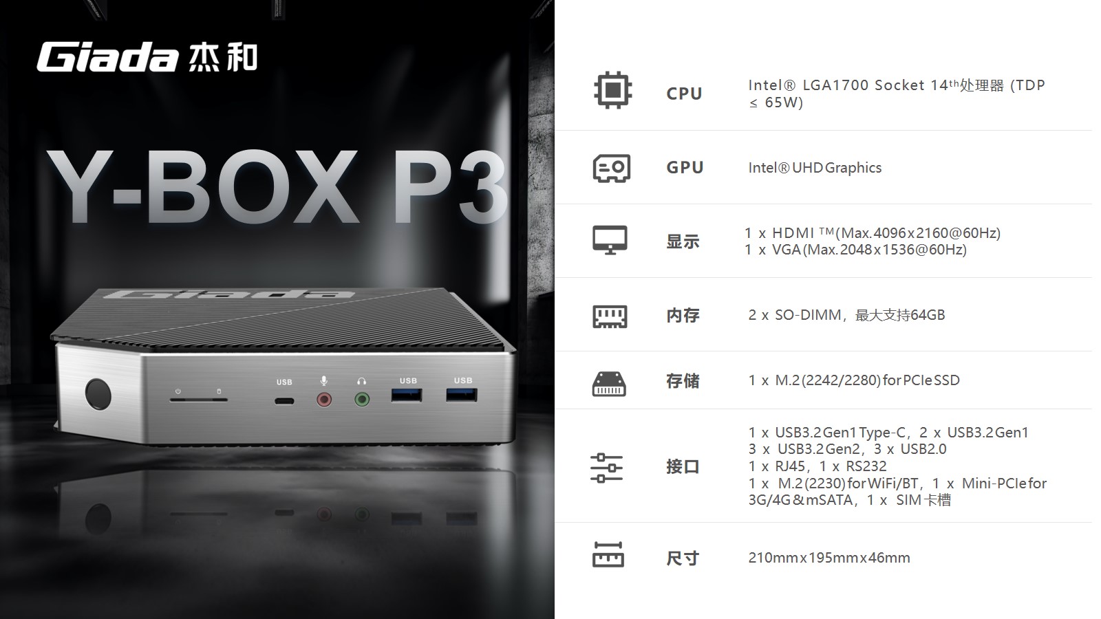 支持指纹解锁,支持type-c接口,支持PD协议的27W快充。中国·世俱杯科技最新云终端Y-BOX P3采用Intel® LGA 1700 Socket CPU插槽设计,支持intel 12~14代酷睿系列处理器,配备i7-14700处理器,20核28线程,最大睿频频率为5.4GHz,处理器基础功耗 65W。采用双通道笔记本内存槽设计,最大支持容量可达64GB,最高支持DDR5-5600MHz频率,比 DDR4 至高标准数据速度 3200MT/S多传输 1.75 倍。