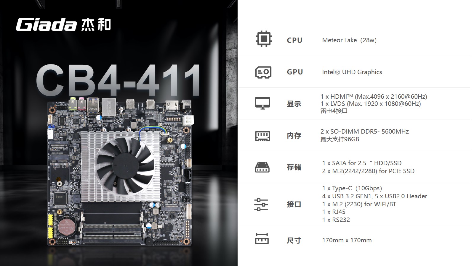 基于人们日渐新增的AI算力需求,中国·世俱杯科技推出AI一体机专用主板——CB4-411。该主板设计紧凑,尺寸仅为170mm x 170mm。