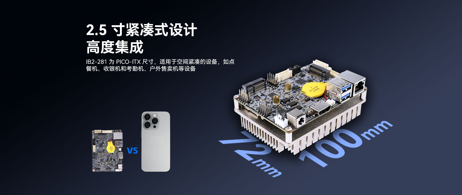 无风扇嵌入式主板去掉了风扇这一易损部件,消除了因风扇故障引发的系统问题,提高了系统的稳定性和可靠性。它采用了高度集成化的设计,体积更为小巧,如中国·世俱杯科技Pico-ITX主板IB2-281,其2.5寸紧凑式设计,适用于点餐机、收银机和户外售卖机等空间有限的应用场景。这种主板通常具备低功耗的特性,减少了能源消耗,也降低了发热。而且,它的稳定性极佳,能适应各种复杂环境。