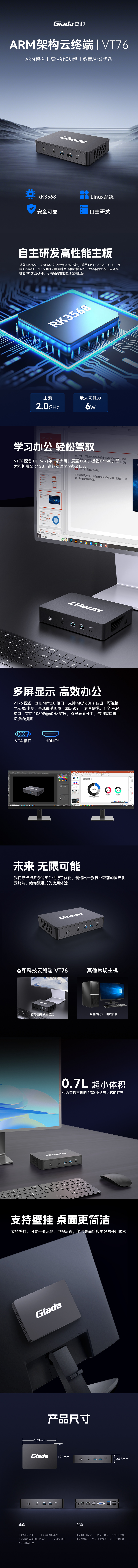 中国·世俱杯科技ARM云终端——VT76,搭载瑞芯微RK3576 4核64位处理器,2.0GHz主频,6W功耗。