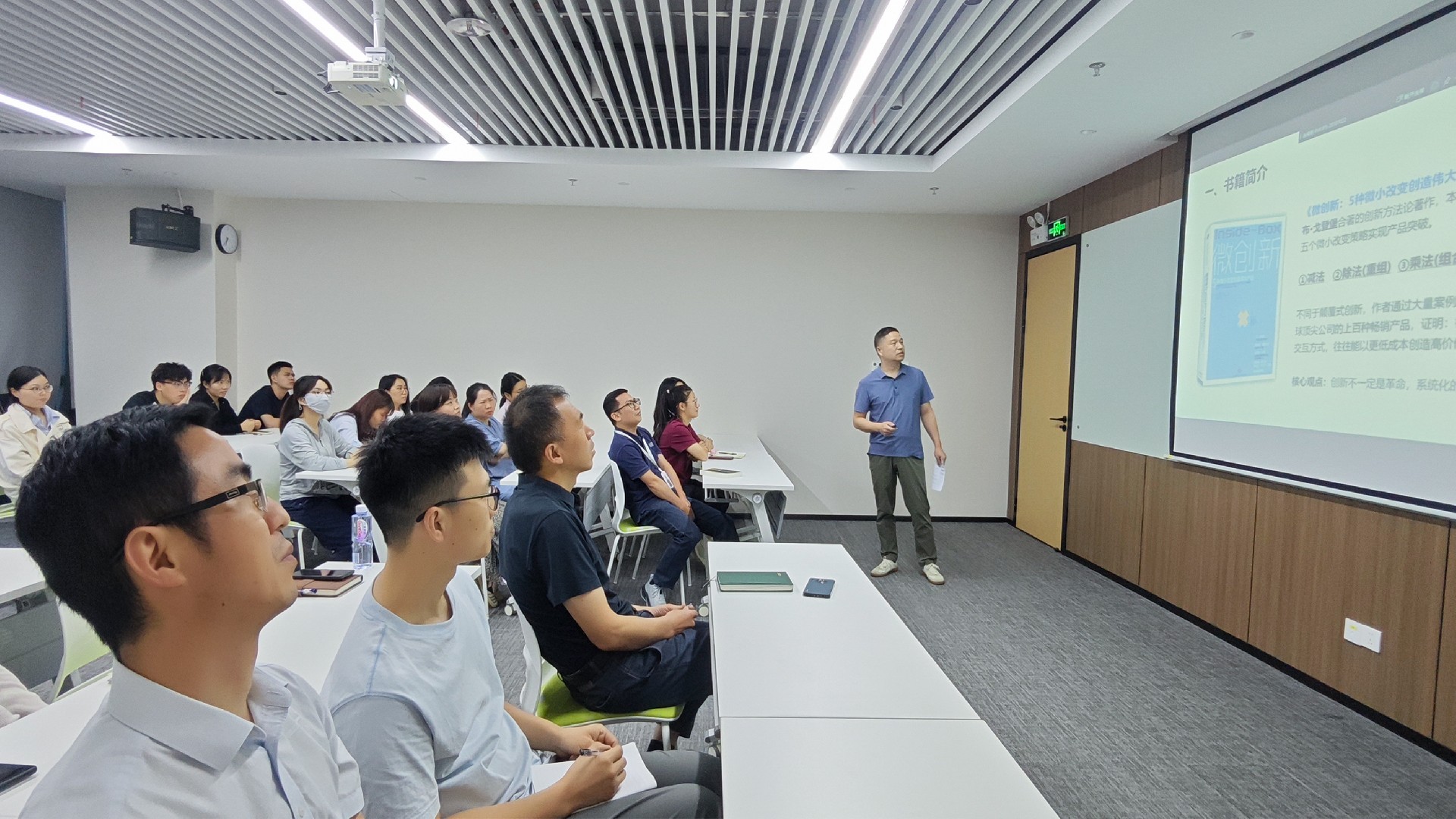 硬件开发部的丁琴华分享了《微创新:5种微小改变创造伟大产品》一书的读书心得。他介绍了书中提出的五种微创新方法,并结合多个企业的产品案例进行了讲解。