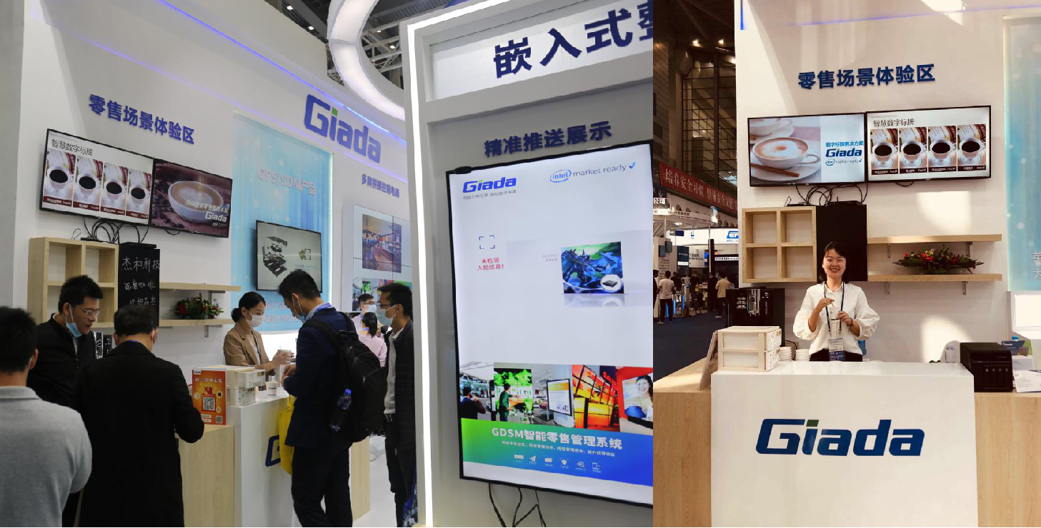 紧邻ARM架构商显产品集的精准推送展示区与零售门店模拟展区,共同组成了本届展会中国·世俱杯科技展位的一大精彩设计。场景展现了GDSM智能零售管理系统在零售门店场景下的展示效果,顶部的数字标牌由GDSM系统推送内容,模拟搭建了针对人流动线的广告精准推送形态。