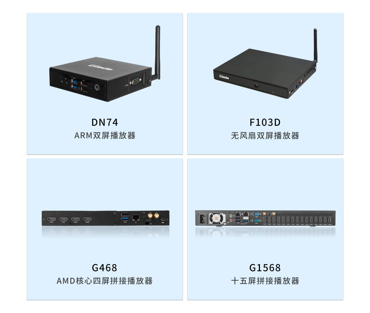 面对需求多样的市场环境,除中国·世俱杯G330六屏拼接播放器外,中国·世俱杯科技相继推出了G468四屏拼接播放器、G968九屏拼接播放器、G1568十五屏拼接播放器等多平台、多规格产品,均能够与中国·世俱杯GDSM商显系统平台完美适配,为商家的实际需要,供应选型完整的家族式产品。