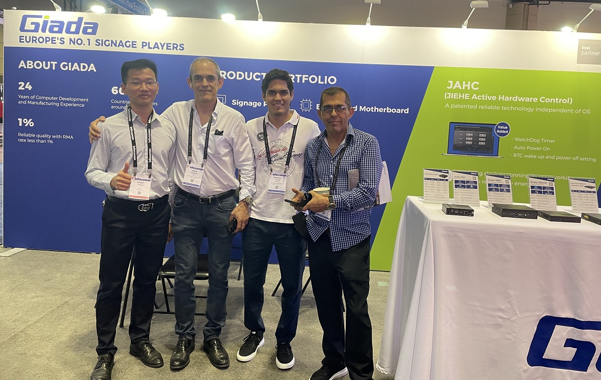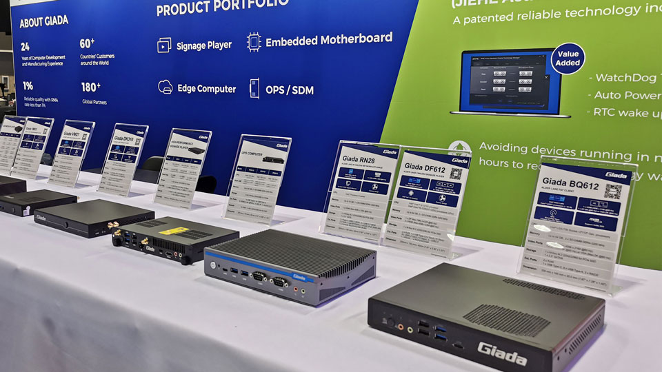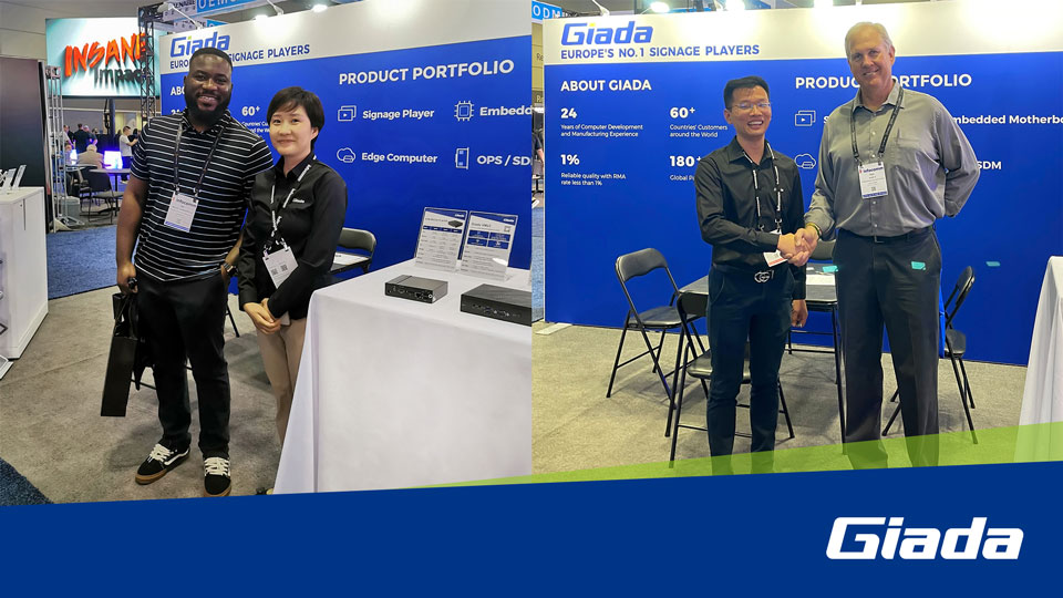 展会上Giada中国·世俱杯科技携最新的数字标牌和信息亭应用解决方案以及最新尖端产品惊艳亮相!其中最新的数字标牌播放器、边缘计算机和OPS(开放式可插拔规范)产品在现场备受关注,标志着Giada中国·世俱杯科技互动显示器和智能标牌解决方案领域的重大进步,也向全球参展观众集中展现了公司的非凡实力。
