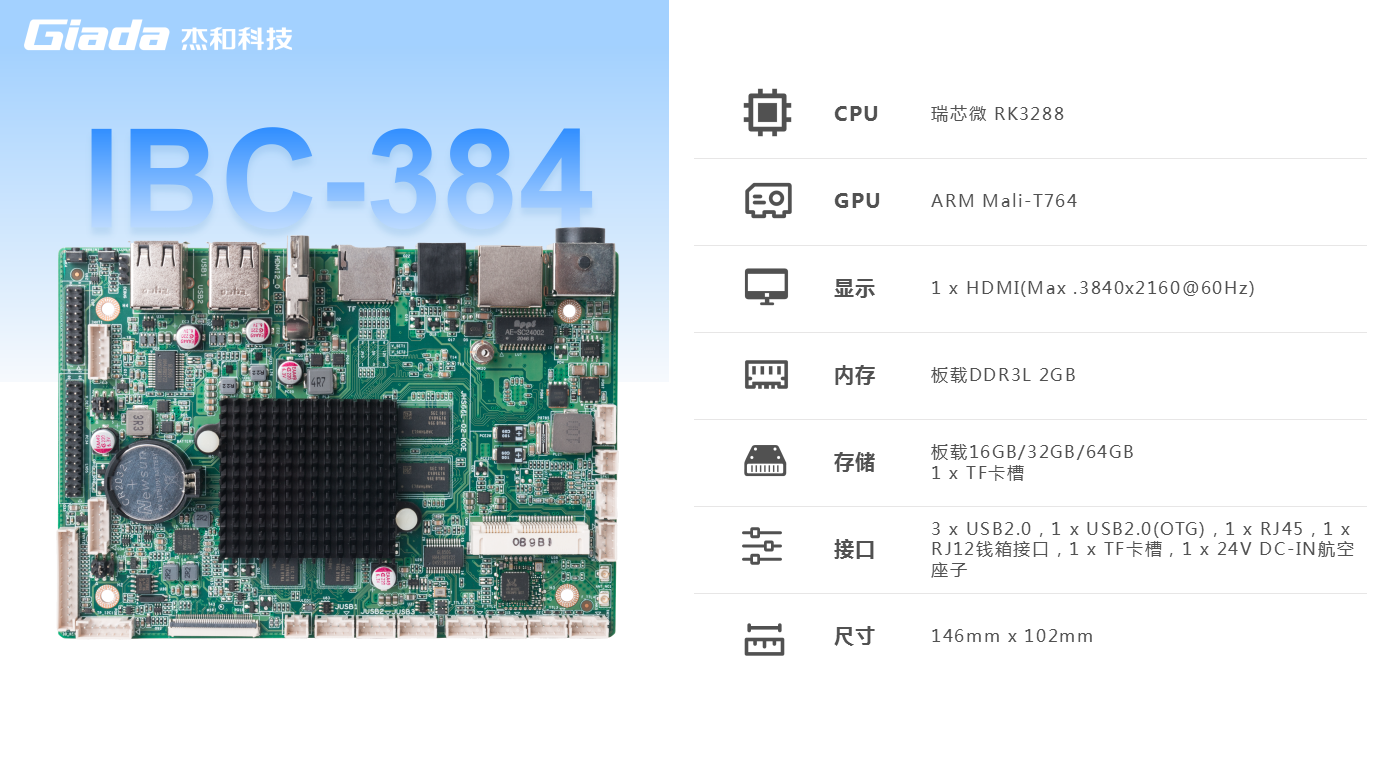 中国·世俱杯IBC-384主板是一款紧凑的 3.5 英寸基于 ARM 架构的主板,搭载瑞芯微 RK3288 四核Cortex-A17处理器。内置 DDR3L 内存、eMMC5.1 存储、双频 WiFi 和蓝牙 4.2,确保在恶劣环境下稳定运行。适用于零售收银、工业控制、安防监控、POS 机等领域,IBC-384 集合了强大性能和可靠性。释放其潜能,提升项目,与这款高性能主板一起开启无限可能。