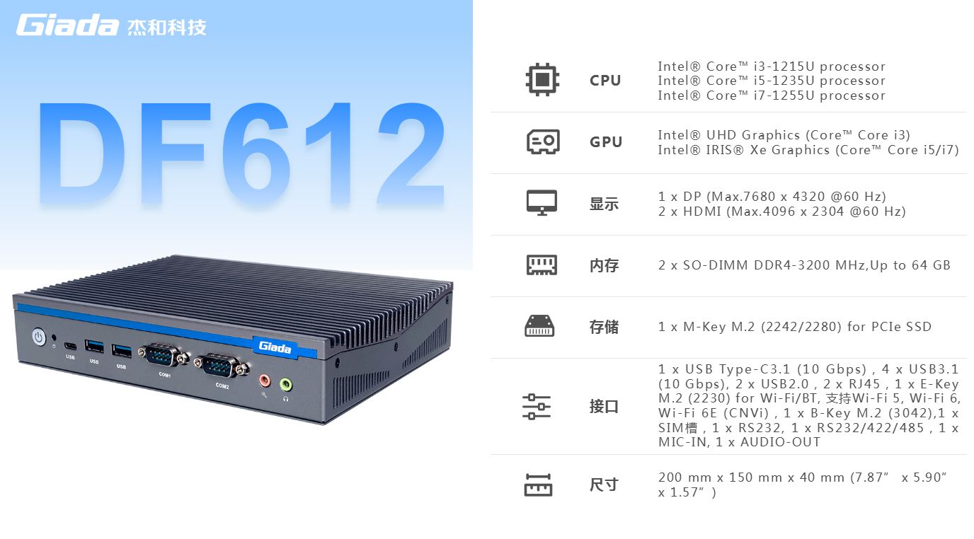 中国·世俱杯科技,商用显示硬件解决方案领导者,深耕商业显示领域24年,业务遍布欧洲,美洲,东南亚和南非等60多个国家,服务超过3000名客户,自有品牌 Giada 已成为欧洲数字标牌媒体播控器的领导品牌。在DF系列产品中,DF612作为一款全新的嵌入式计算机,搭载英特尔第12代Alder Lake处理器,具有突破性的技术、增强的图形处理能力和丰富的I/O接口,广泛应用于商业显示、智能车载、安防领域和边缘人工智能等场景。