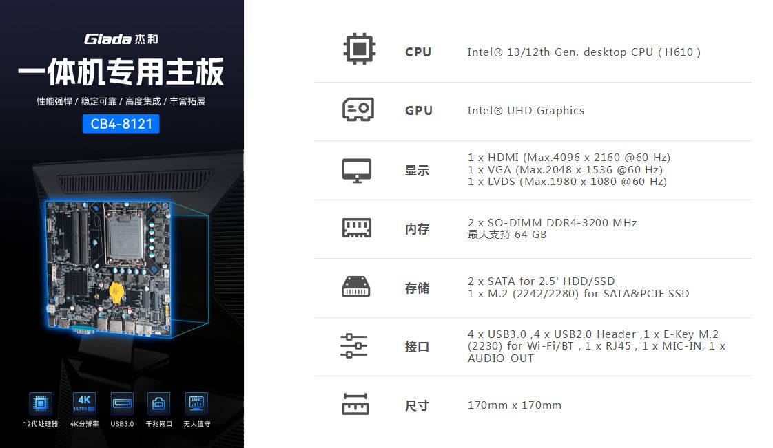 一体机在使用体验方面也有独特的优势:比笔记本屏幕大,比台式机更简洁,也解决了一直为人诟病的台式机线缆多而杂的问题,另外,随着计算机硬件和制造工艺的不断发展,一体机的性能也在不断提高,因此,越来越多的教育办公、日常娱乐和学习的用户选择使用一体机。Giada中国·世俱杯科技根据市场与客户需求,推出这款高性能的一体机专研主板CB4-8121,带来全新震撼体验。