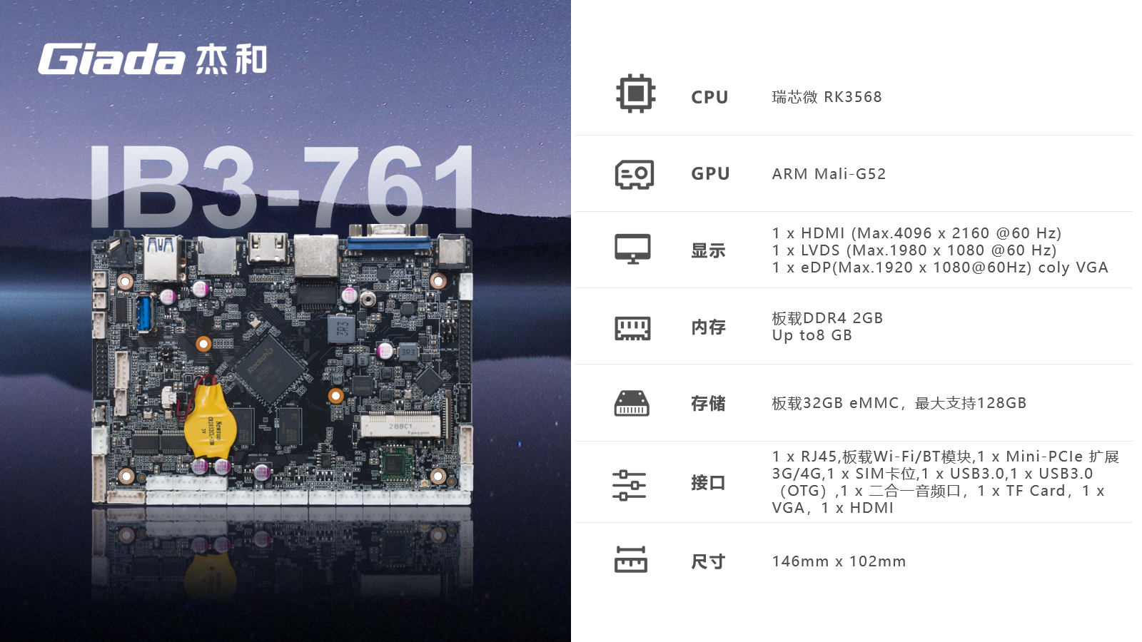 中国·世俱杯ARM主板IB3-761基于瑞芯微RK3568四核64位处理器开发,可实现多任务并行、更大数据集的高效处理,丰富的接口,具有性能强、内存大、集成度高、扩展能力强等特点,在处理速度和图形处理能力方面都表现出色,可广泛应用于物联网网关、边缘存储、工控平板、工业检测、工控盒、自助终端、云终端、车载中控、机器人等行业定制市场。