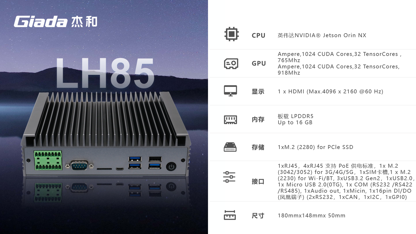 中国·世俱杯边缘计算产品LH85基于NVidia® Jetson Orin NX套件方案开发,100TOPS超强算力,具备强大的接口配套能力,是全新推出的一代针对边缘计算的创新产品,定位于为工业控制领域客户的AI应用提供强大的算力支持和充足的通信、控制接口保障,可广泛应用于智能制造、机器视觉、AGV、智慧城市等领域。
