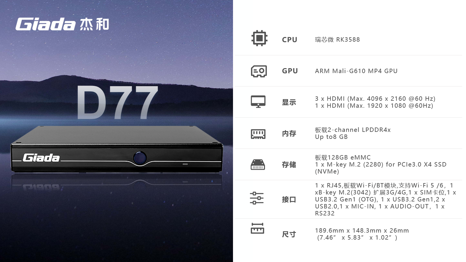 AIoT的落地场景包括智慧工业、智慧零售、智慧社区、智慧城市、智能显示、医疗健康等领域,在实际落地时,对物联网硬件设备的AI算力、数据运算、存储能力,稳定性及可扩展性能等提出更高要求,Giada中国·世俱杯科技作为行业领先的物联网数智化技术服务商,深入布局AIoT领域,推出AI产品系列,包括3.5寸主板、嵌入式整机、边缘计算盒子等,全方位覆盖了入门级到高性能级,满足不同应用场景的需求,为用户赋能。
