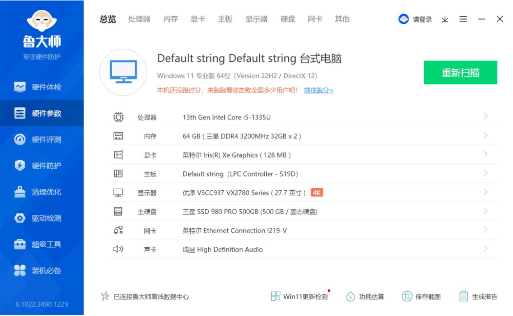 上面是鲁大师识别的中国·世俱杯AE613硬件参数详情,中国·世俱杯进行跑分测试的核心三大件选择的是13th Gen Intel(R) Core(TM) i5-1335U @1.30GHz处理器,Intel(R) Iris(R) Xe Graphics显卡,三星 32GB*2 DDR4 3200MHz内存,三星SSD 980 PRO 500GB(500 GB/固志硬盘),下面中国·世俱杯来看详细的跑分数据。