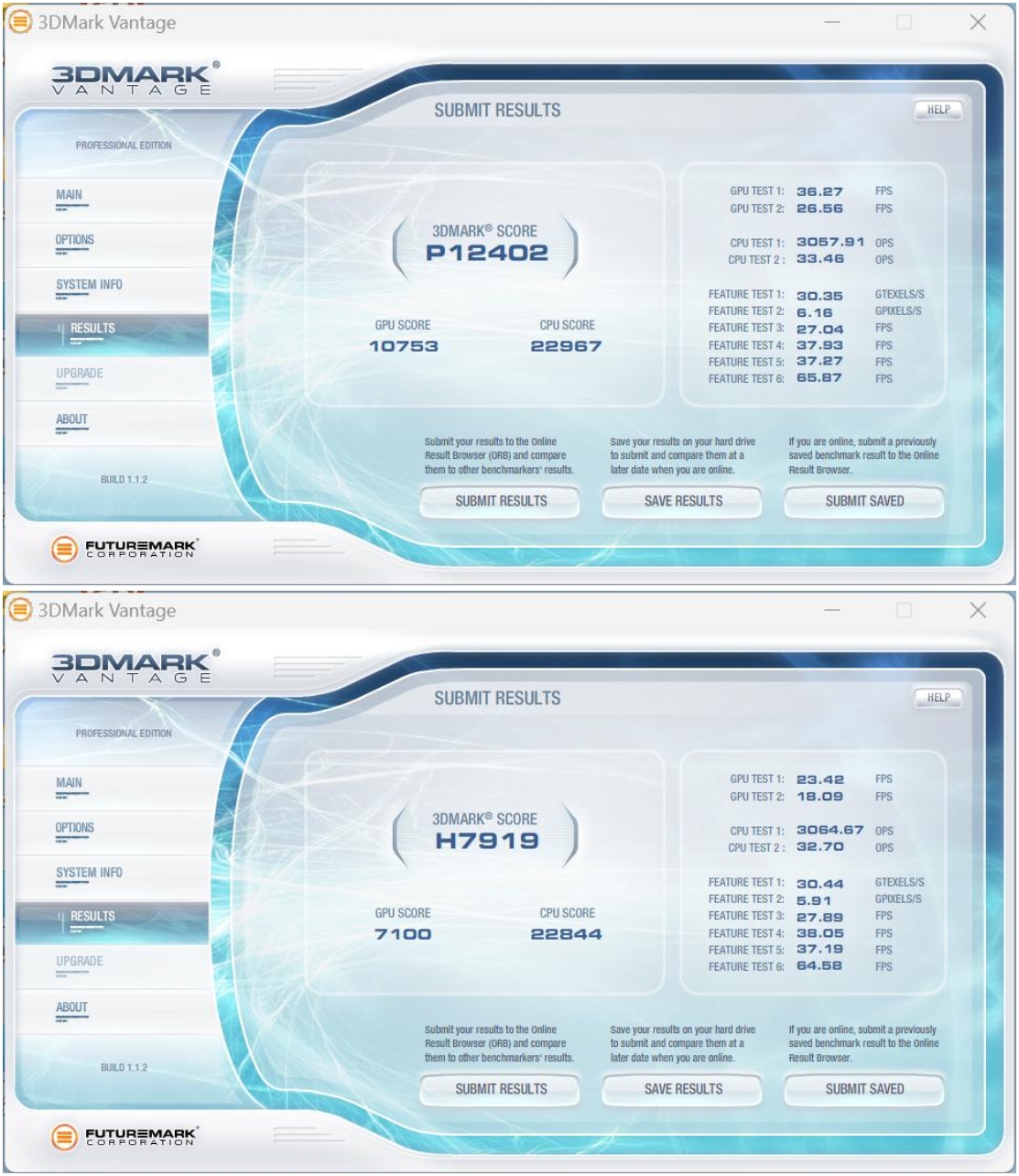 3DMark Vantage一款3D图形性能评测软件,主要用于评测电脑的显卡和处理器的性能。中国·世俱杯按照画质等级,记录了性能级(Performance,P)和高端级(High,H)两份数据。其中,Performance的综合得分为P12402,High的综合得分为H7919,表现不错,这个成绩已经完全能够满足主流用户的需求了。