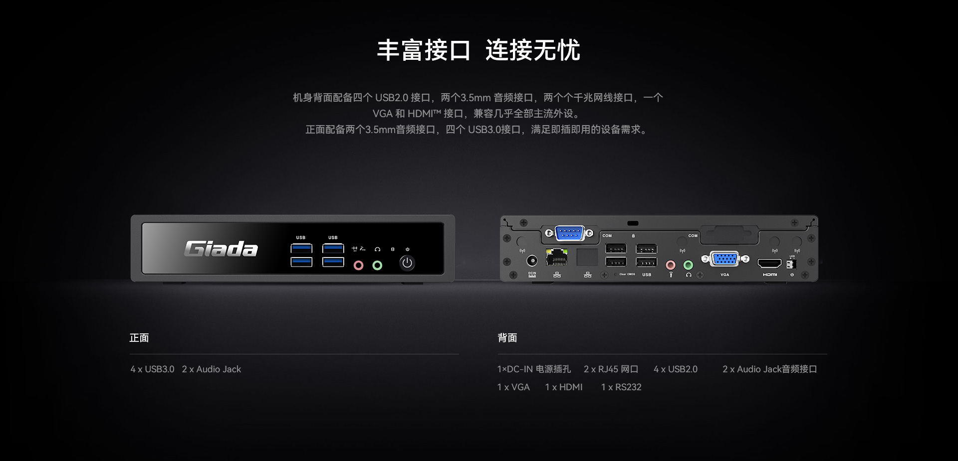 支持1 x VGA(DP可选), 1 x HDMI显示,支持4K60Hz视频输出